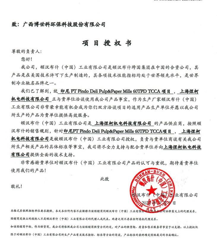 DunHam-Bush頓漢布什授權上海煜柯機電科技有限公司參加廣西博世科環保總承包的印尼PT TCCA項目。