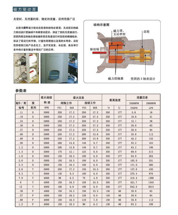 它無脈動(dòng),無泄漏,精度可達(dá)0.25%或更高,可處理的介質(zhì)粘度范圍可達(dá)0.3cps-50000cps,流量可以從0.06L到2400L/h,壓差可以達(dá)到17.2Bar,系統(tǒng)壓力可達(dá)34Bar,當(dāng)它運(yùn)行在2900rpm高轉(zhuǎn)速下時(shí)預(yù)期壽命為20000小時(shí)(介質(zhì)中無固體顆粒)。