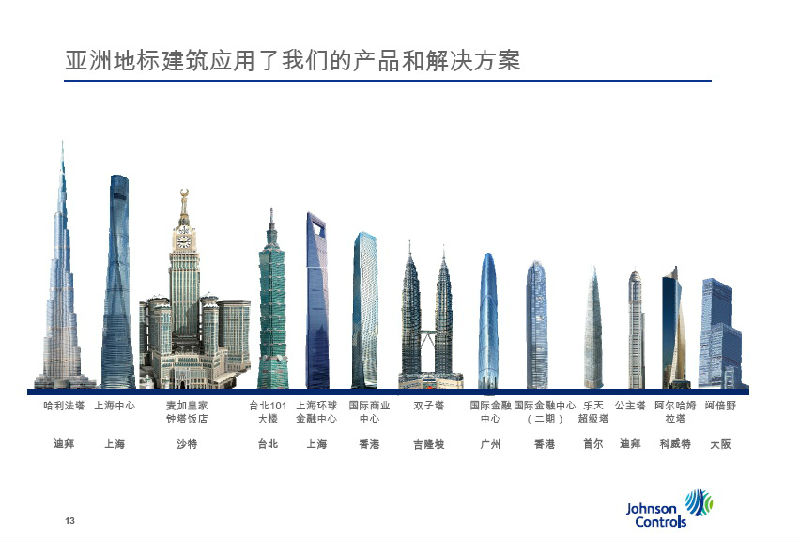 江森自控智慧建筑科技與解決方案業務在中國大陸地區擁有逾5000名員工,39個辦事處,近1000家合作伙伴,3個制造基地(2個在無錫,1個在廣州)以及1個位于無錫的亞洲技術研發中心。隨著亞洲市場需求的日益增長,江森自控宣布將第二個全球總部落戶上海。該總部計劃將于2017年完工并正式投入使用,此舉凸顯了江森自控對于中國市場的重視及承諾。江森自控智慧建筑科技與解決方案業務為綜合樓宇提供服務,包括上海世博會建筑、上海環球金融中心和北京國家體育場(鳥巢)等。我們采用全面的生命周期管理方法,有效管理建筑物內部運營及其技術,涵蓋了規劃與設計、安裝與整合、優化與維護等。我們提供以下專業的服務: