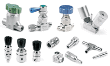 通用儀表閥門和接頭,產品接口尺寸范圍:1/16"至2",最大工作壓力為10,000psi,使用溫度為-54℃至649℃,主體材料可選各種不銹鋼、合金、尼龍及PTFE等。