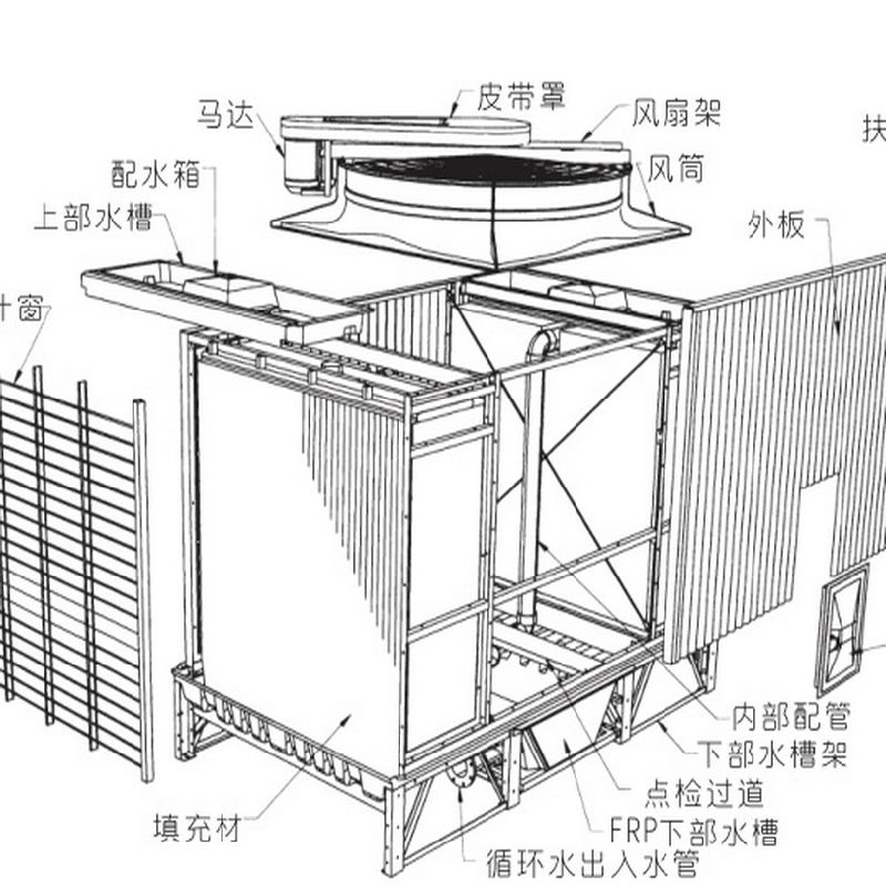 開式冷卻塔的冷卻原理就是,通過將循環(huán)水以噴霧方式,噴淋到玻璃纖維的填料上,通過水與空氣的接觸,達到換熱,再有風(fēng)機帶動塔內(nèi)氣流循環(huán),將與水換熱后的熱氣流帶出,從而達到冷卻。