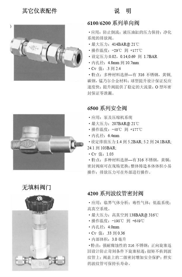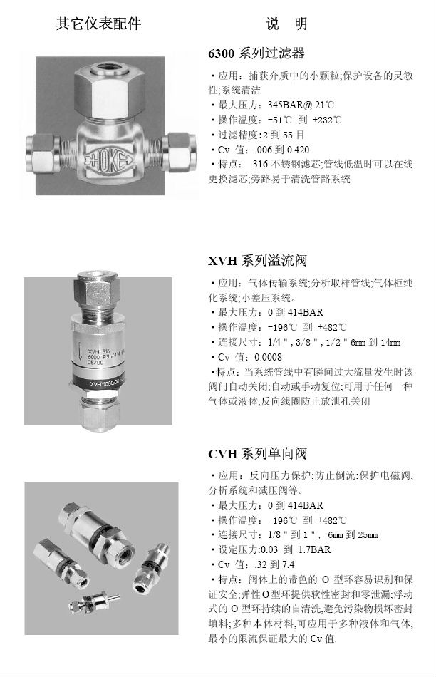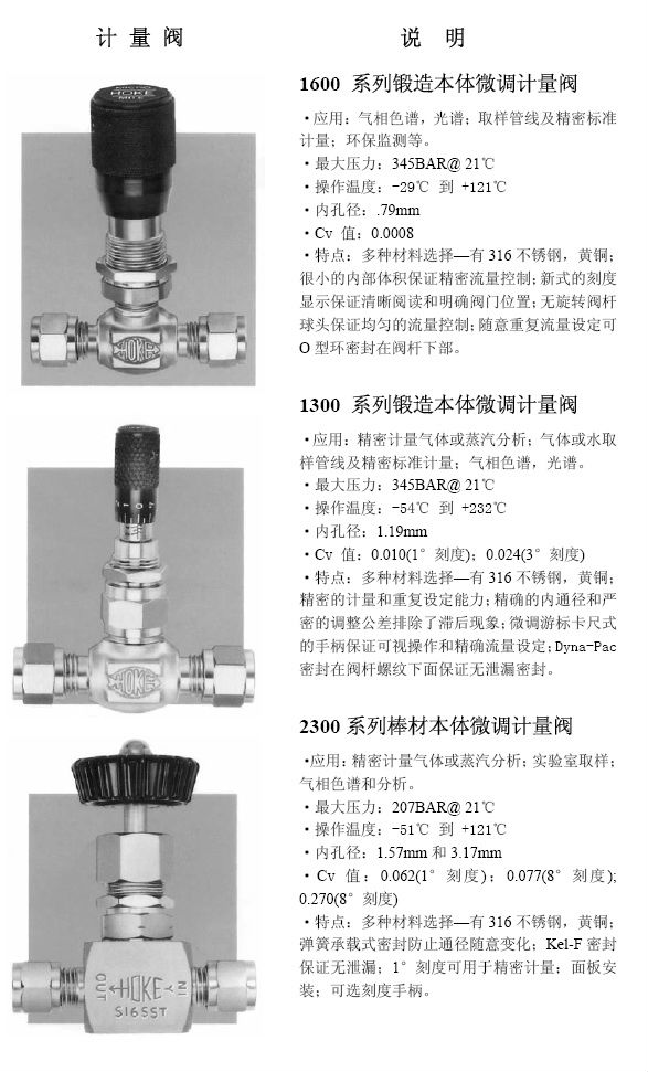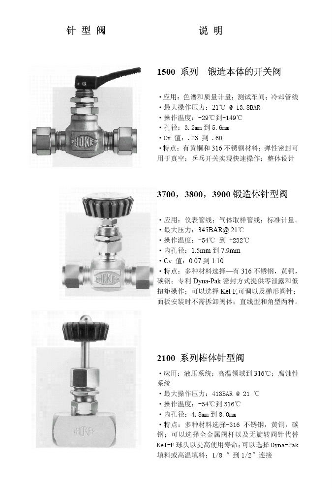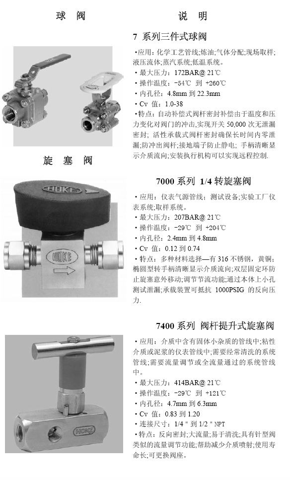 并且HOKE公司經過數年的經營,已為其設計和生產的高品質的HOKE閥門建立了一流聲譽,并且在追求最高品質和服務的同時,HOKE公司也為產品的安全性,可操作性,耐久性和可靠性建立了工業標準。據此,我們也很自豪的成為一些全球最杰出公司的可靠供應商,諸如:British Petroleum,Dow Chemical,E.I.DuPont,Exxon.Rolls Royce,Shell Oil以及Veba Oel 等。